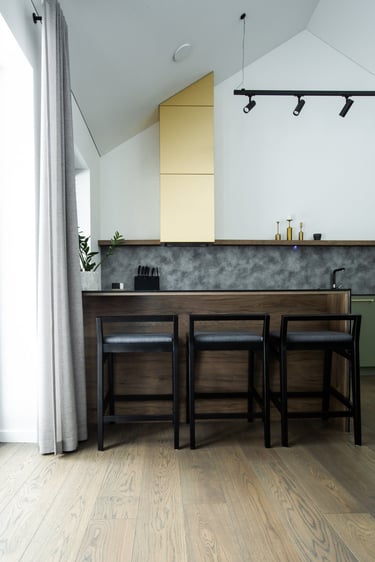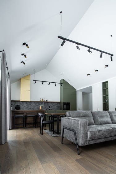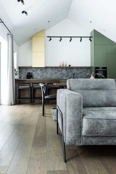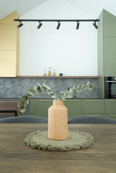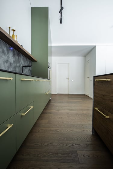 Todėl galėjome rinktis tamsias grindis ir įnešti dar daugiau spalvų interjere. Čia pasirinkome žalios spalvos virtuvę.