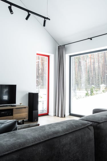 Išskirtinis šeimos namas su raudonu langu, kuris tapo tikru akcentu tiek išorėje, tiek viduje.